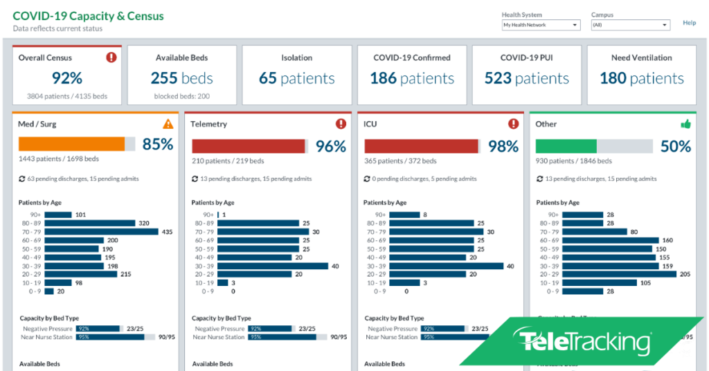 TeleTracking released an enterprise COVID-19 capacity and census dashboard to its SynapseIQ Enterprise customers on April 1, 2020 to equip health systems with the critical information needed to prepare for and respond to the COVID-19 patient surge. The dashboard provides real-time information related to patient census, bed availability, confirmed and possible COVID-19 patients, patients in need of ventilation, capacity of specialized treatment areas such as negative pressure and ICU rooms and patients by age. The dashboard is also available to hospitals currently using TeleTracking Capacity Management Suite™ version 3.4 or greater.